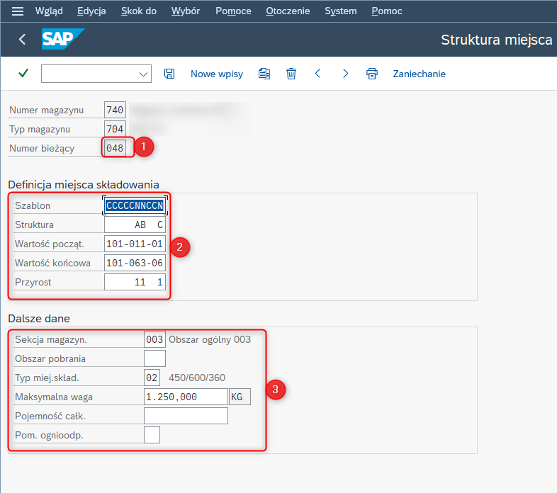 Warto zapamiętać numer bieżący struktury (w przypadku gdy zamierzamy skopiować istniejący wpis) ponieważ podczas tworzenia nowego będziemy musieli podać jego kolejną wartość. W oknie nowego wpisu musimy zdefiniować numer magazynu, typ magazynu a także numer bieżący (1 – na obrazku niżej). Następnie definiujemy szablon dla struktury (2) oraz wprowadzamy dalsze dane dla miejsc składowania (3).