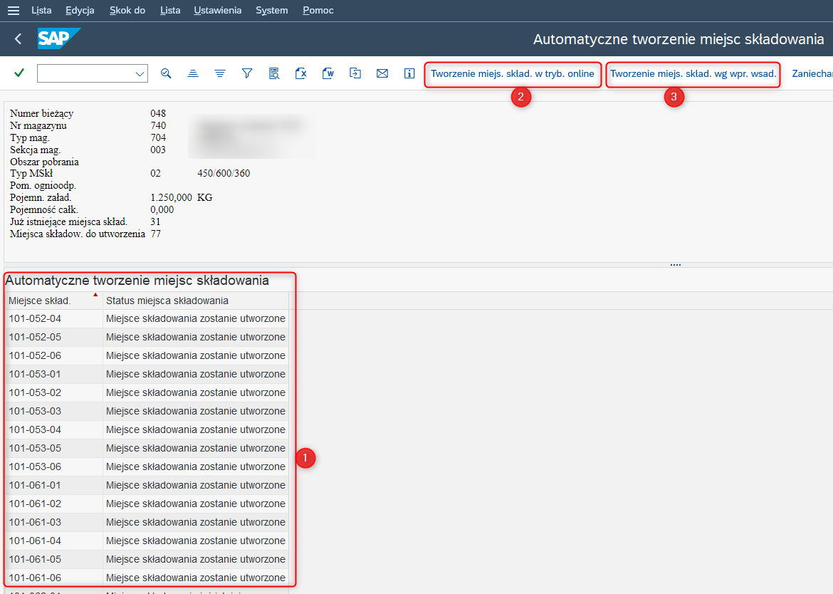 Proszę zwrócić uwagę jak wygodne jest definiowanie danych podstawowych miejsc. W przypadku transakcji LS01N, każdą wartość trzeba wprowadzać ręcznie. Tak jak wspomniałem wcześniej, może dojść do pomyłki nawet przy wprowadzaniu maksymalnej wagi. Podobnie sprawa wygląda z sekcją magazynową czy typem miejsca składowania. Tutaj wprowadzając dane tylko jeden raz, możemy wygenerować nawet tysiące miejsc jednym klikiem (musimy tylko poświęcić chwilę czasu na opracowanie struktury).