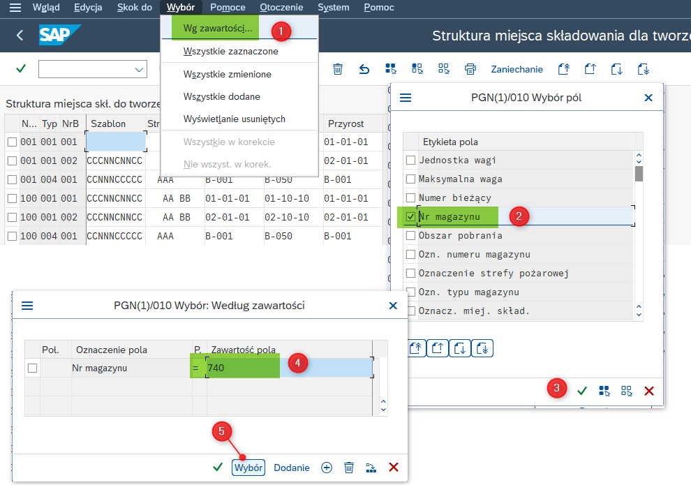 Polecam jednak opcję skopiowania już istniejącego wpisu i zapisania go jako nowy. Daje to możliwość porównania danych istniejących z tymi, które są aktualnie tworzone. W celu odnalezienia swojego numeru magazynu wybieramy z poziomu menu: wybór -> wg zawartości -> następnie wybieramy pole na podstawie, którego chcemy przefiltrować dane (w przykładzie będzie to numer magazynu). W kolejnym oknie wprowadzamy zawartość pola, którą chcemy wyszukać: