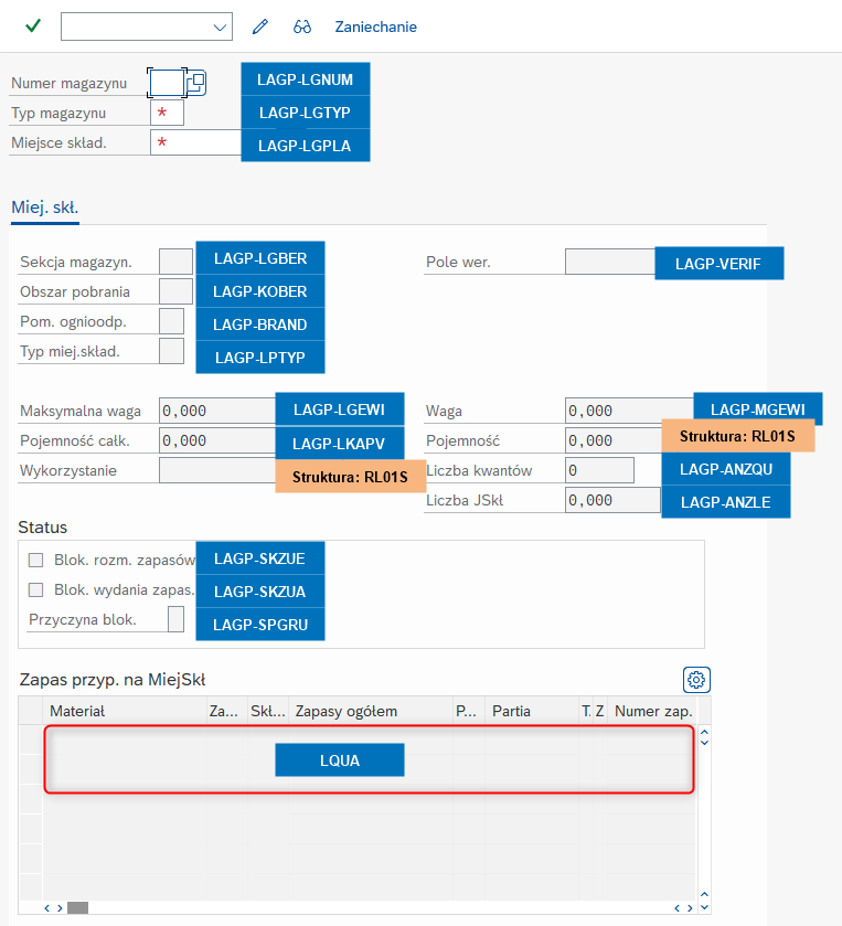 Warto wspomnieć, że transakcja LS01N zawiera również pola, których nie znajdziemy w tabeli LAGP („wykorzystanie” i „pojemność”). Nie są one wypełniane przez użytkownika podczas tworzenia miejsca składowania. Te dane uzupełniane są automatycznie przez system w trakcie wczytywania transakcji przeglądu lub edycji miejsca składowania LS02N/LS03N. Korzystają one ze struktur bazy danych (w tym przypadku RL01S). Oznacza to, że podczas wczytywania transakcji, system wczytuje dane z różnych tabel (nie tylko z LAGP, ale i z LGNUM, LGTYP, LGBER itd.) stanowiących strukturę. Następnie dane pobrane ze struktury wyświetlane są na ekranie transakcji.