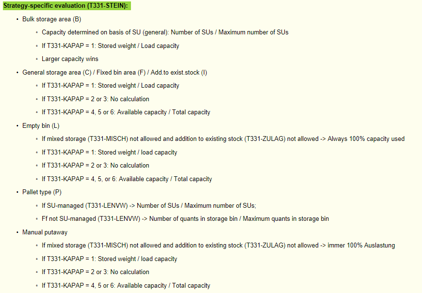 Wynik kalkulacji zależy od tego jak ustaliliśmy strategię rozmieszczania i wydania zapasów w typie magazynu, np. jeśli zdefiniujemy, że nasz typ magazynu nie zezwala na składowanie niejednorodne i dodanie do zapasu, wtedy wynik kalkulacji zawsze będzie wynosił 100% wykorzystania. Proszę zerknąć na poniższy zrzut ekranu z aplikacji pomocy SAP GUI (dotyczącej kalkulacji wykorzystania miejsc składowania):