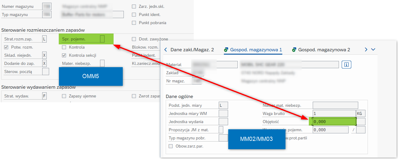 „Pojemność” natomiast to porównanie wartości zdefiniowanej jako pojemność w danych podstawowych materiału lub/oraz wykorzystania pojemności typu jednostki składowania (dane paletyzacji). Kalkulacja będzie możliwa tylko w przypadku aktywowania kontroli pojemności na poziomie typu magazynu (pole KAPAP tabeli V_T301). Proszę spojrzeć na poniższy rysunek: