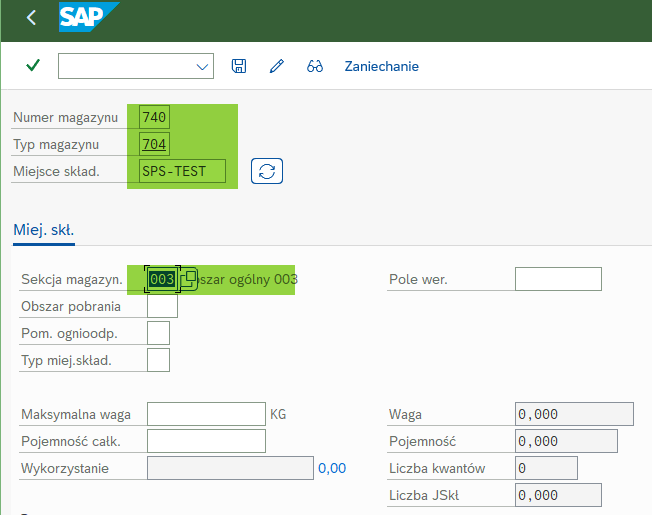 Jak widać wyżej, podczas tworzenia nowego rekordu dla miejsca składowania, użytkownik wprowadza dane do pól tabeli LAGP.