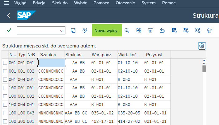 Przechodzimy do transakcji LS10. System wyświetli wpisy dostępne dla wszystkich numerów magazynów. To jest powód dla, którego dostęp do transakcji powinni mieć tylko doświadczeni użytkownicy. Jeśli chcemy utworzyć strukturę całkowicie od nowa klikamy przycisk „nowe wpisy”: