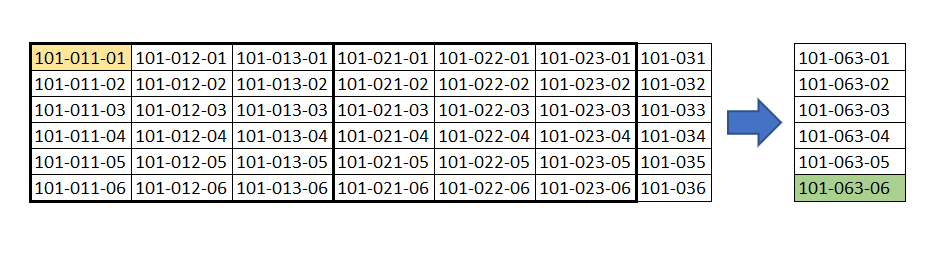 Wyobraźcie sobie że potrzebujemy utworzyć regały z nazewnictwem jak niżej. Stojąc na przeciwko regału widzimy, że składa się z kilku sekcji i każda z nich ma 3 rzędy z 6 poziomami. Mamy rząd 011, 012, 013 ale kolejna sekcja nie jest kontynuowana jako 14 tylko zaczyna się z kolejną „dziesiątką” (czyli 021, 022, 023). Regał kończy się na rzędzie 063.