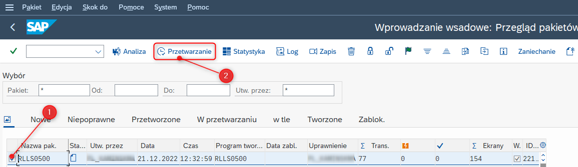 Alternatywnym sposobem jest wykorzystanie pliku wprowadzania wsadowego w transakcji SM35. Musimy tylko wybrać odpowiedni pakiet wprowadzania i kliknąć „przetwarzanie”: