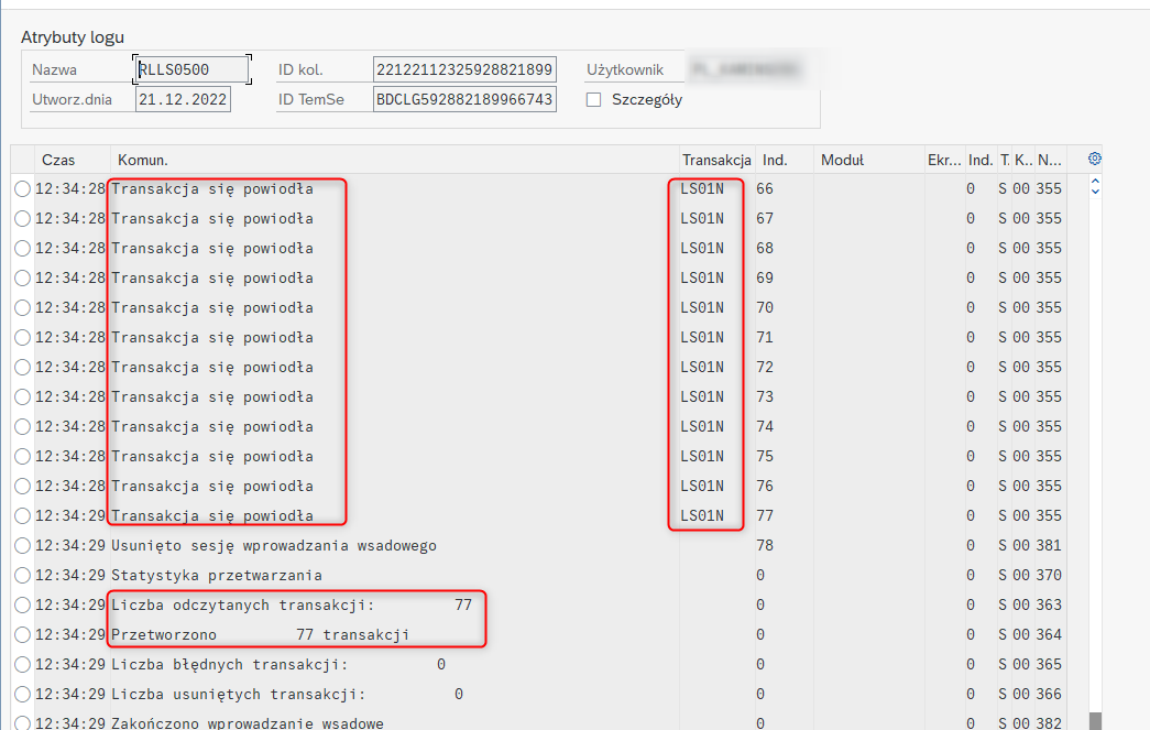 Działa to na zasadzie makra, dzięki któremu system w tle rejestruje kroki transakcji LS01N (za pośrednictwem programu RLLS0500). Po zakończeniu przetwarzania możemy zerknąć w log przetwarzania. Po wciśnięciu przycisk: