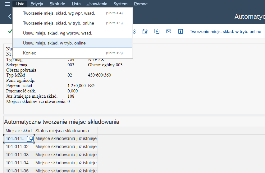 - tworzenie miejsc składowania w trybie online – system utworzy miejsca natychmiast z poziomu transakcji w której przebywamy (LS10).